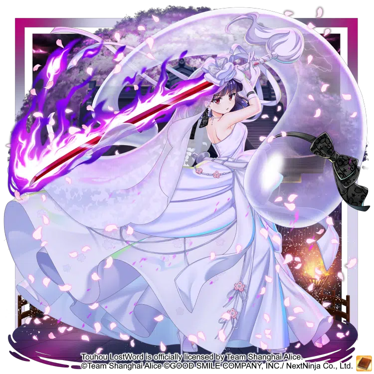Youmu Konpaku (the Mysterious Sword Master)'s Last Word (a Touhou LW original). She raises Hakurouken and Roukanken, then swings them together as if they were a single sword. The moment before this attack is unleashed, the blades show a vision of the Saigyou Ayakashi, the youkai cherry blossom tree, towering over everything. The fact that she can now use such an overpowering technique may be because she finally managed to cut down her own inexperience...